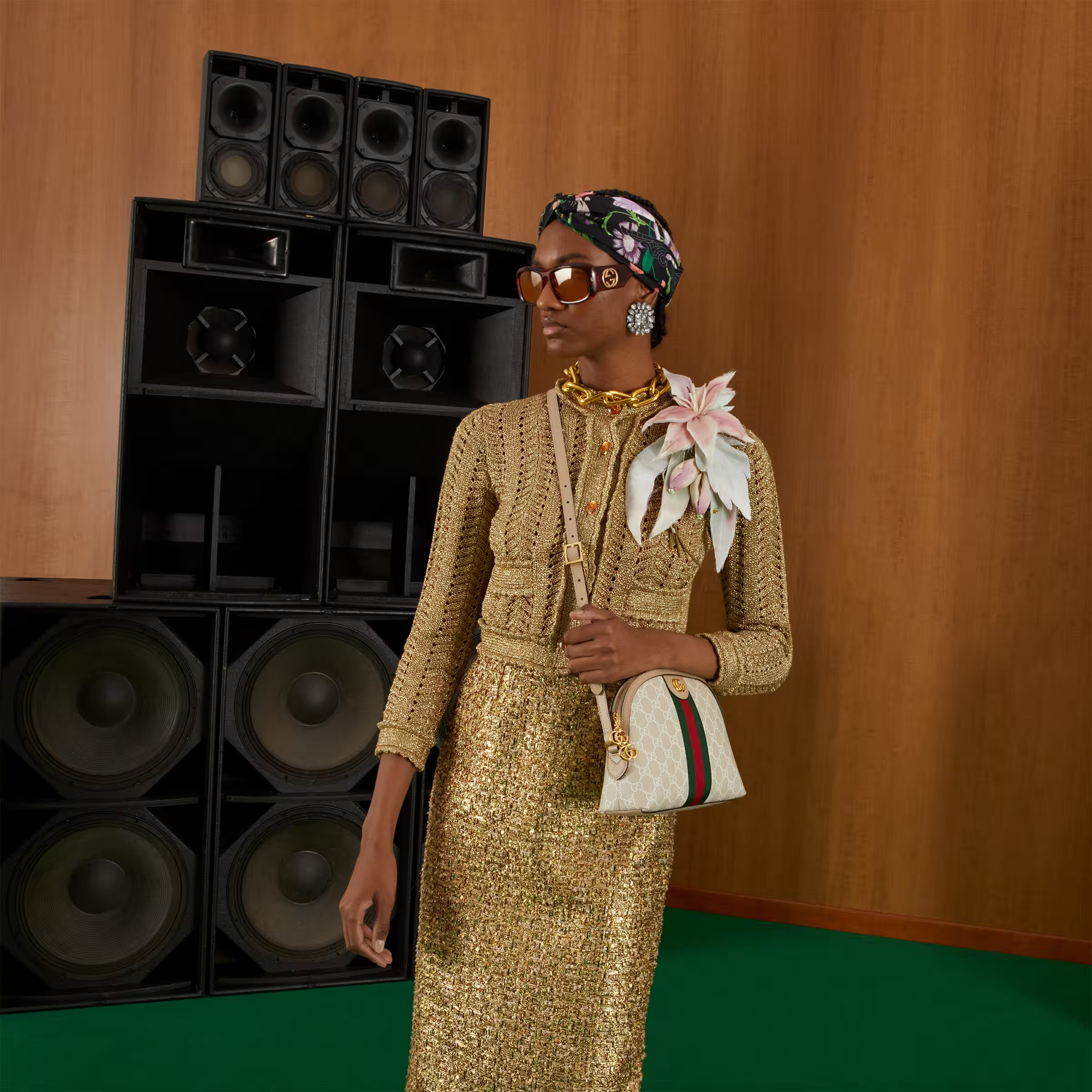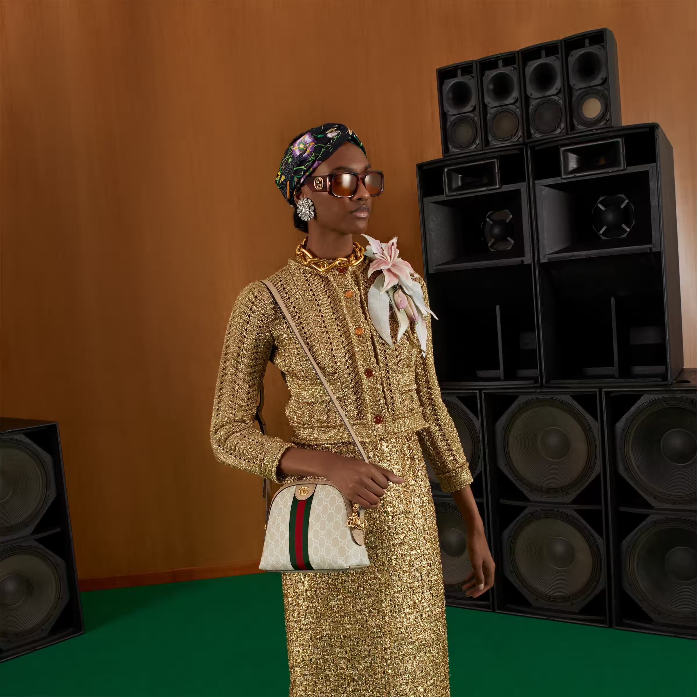 A heritage material from the archive, GG Supreme has been reimagined in Gucci Love Parade in different color combinations and combined with contemporary as well as classic styles. The Ophidia shoulder bag is presented in a beige and white variation of the signature material with a tonal trim. Originally a play on a ’30s design, the canvas speaks to the historical narrative that runs throughout the collection.