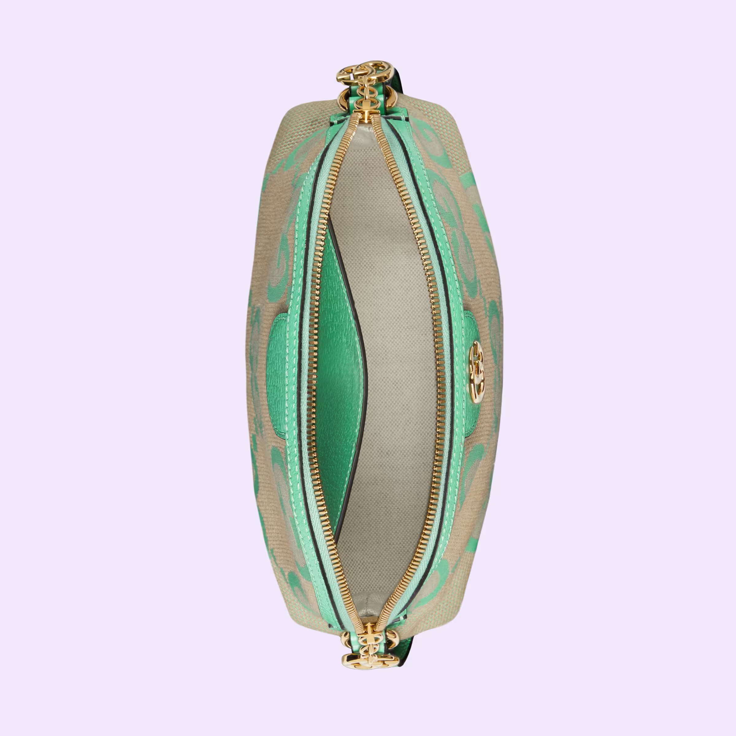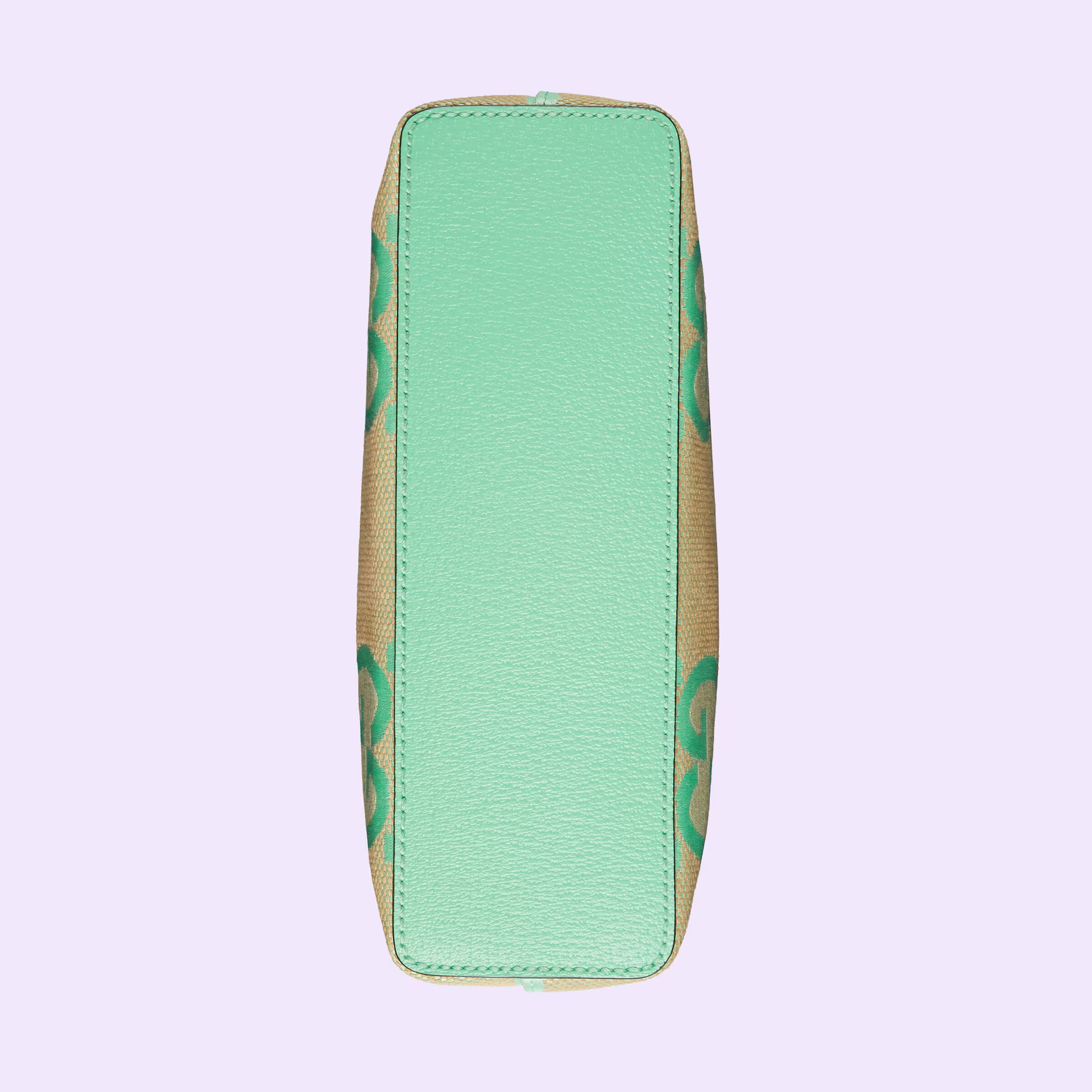 The Ophidia shoulder bag has a domed shape that recalls vintage designs. The jumbo GG explores a new, maximalist version of the historic monogram, animating this small shoulder bag in camel and mint.