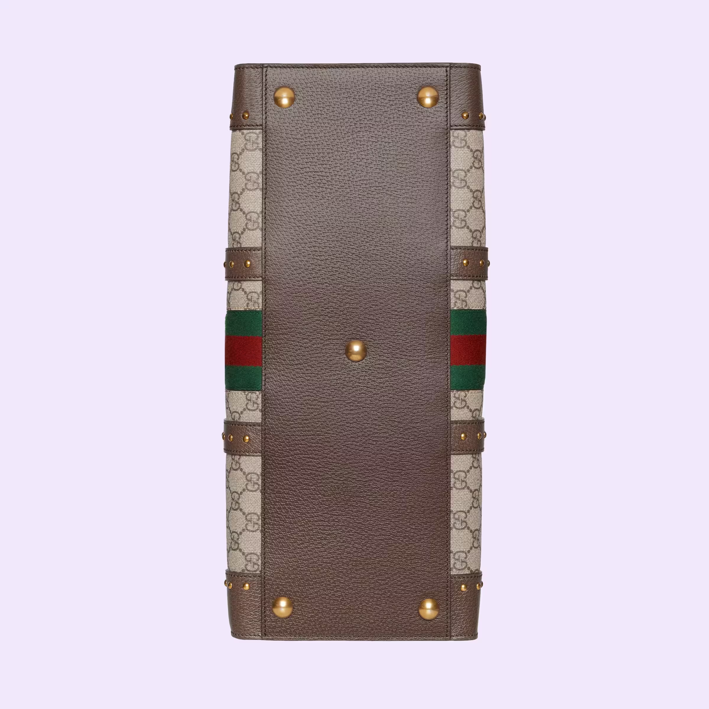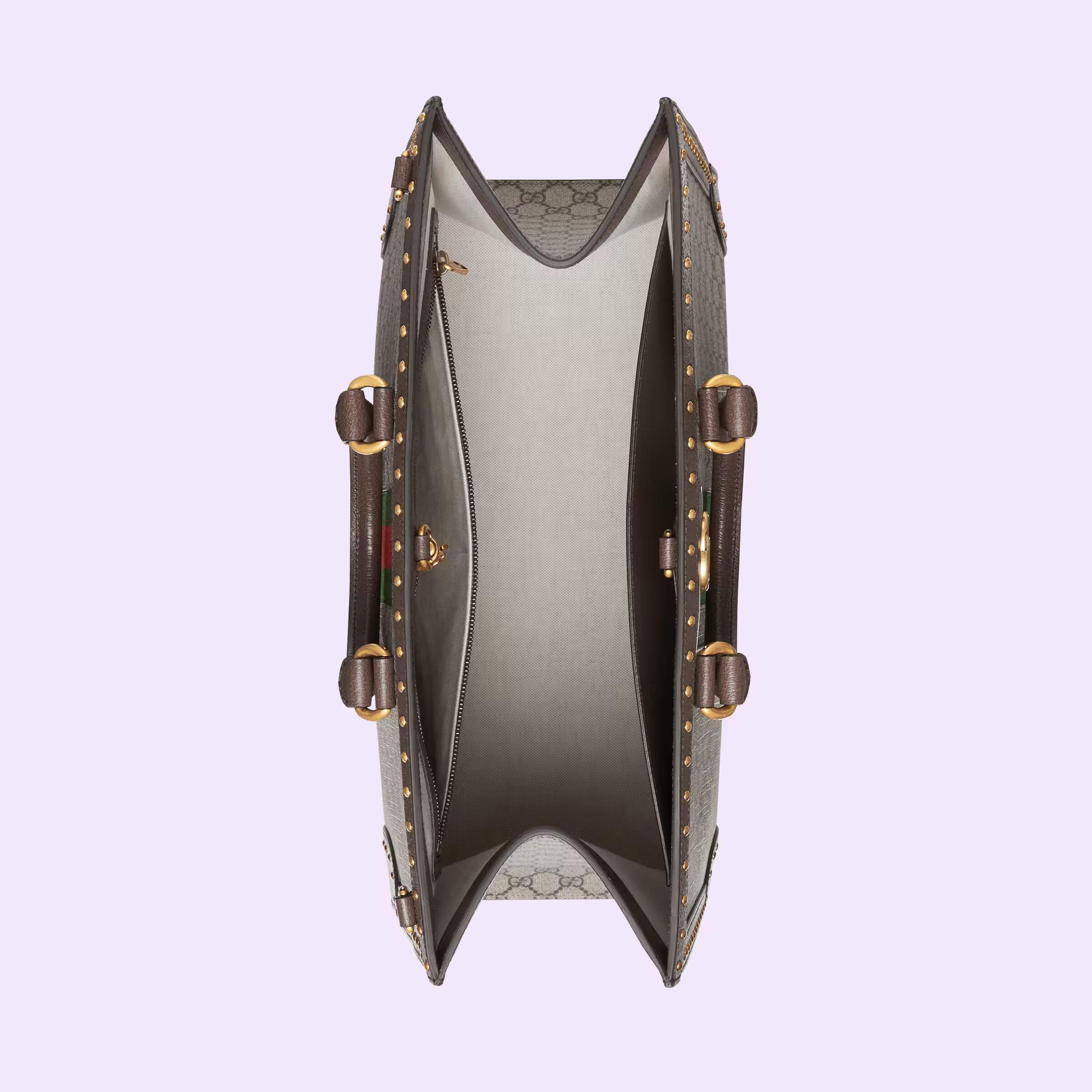 House collections continue the idea that pieces should be timeless and not just in fashion for one season. Guccio Gucci’s everlasting monogram continues to enrich new designs with a logo feel. This large Ophidia tote bag is presented in the signature beige and ebony GG Supreme canvas, complete with Double G hardware and a studded leather trim for an eye-catching design detail.