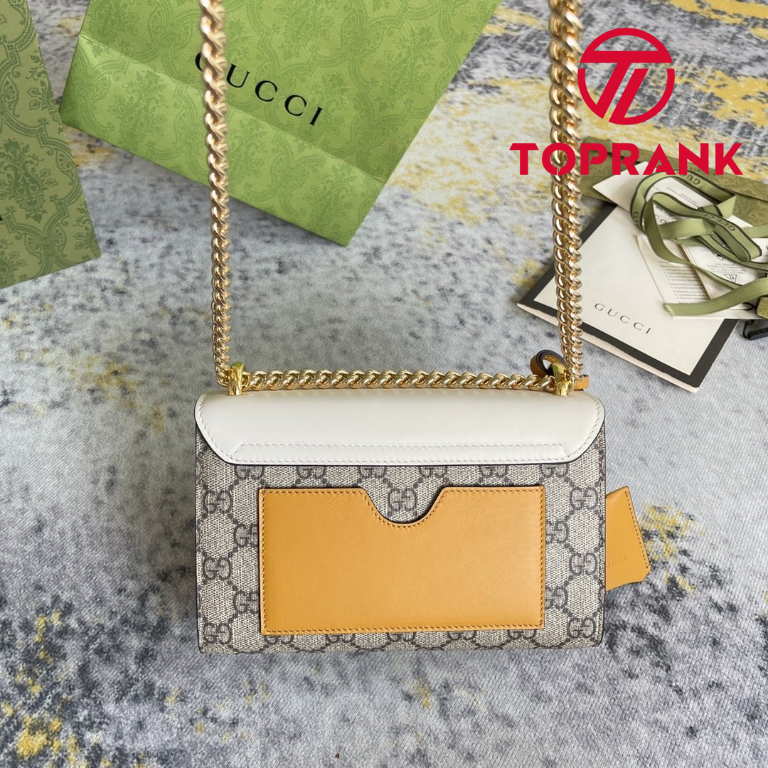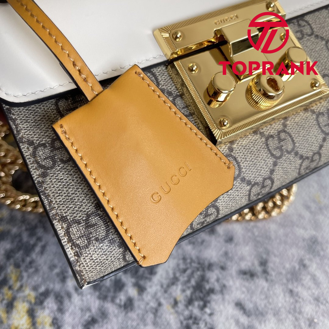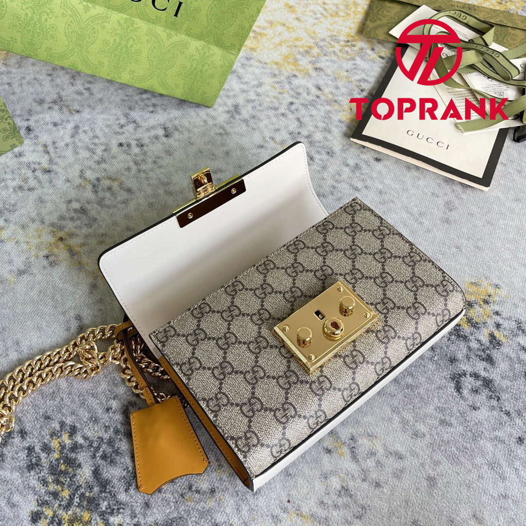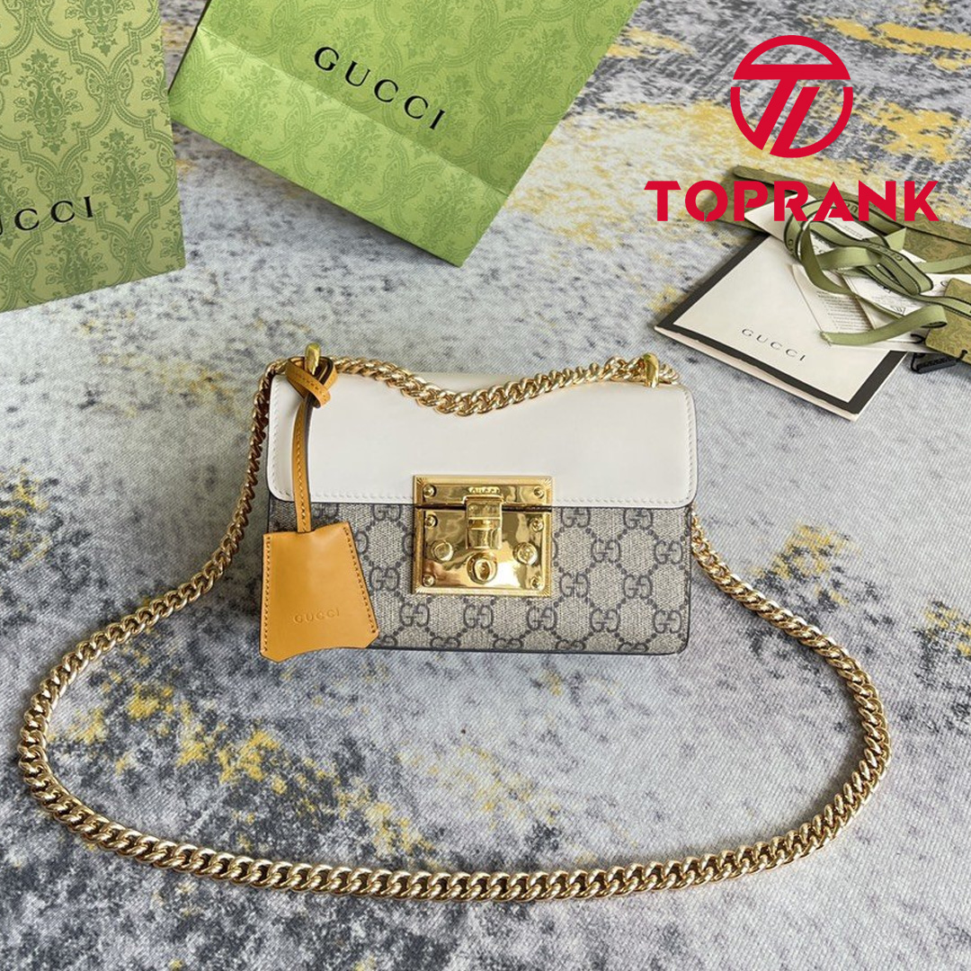 The structured Padlock small shoulder bag is crafted in GG Supreme canvas and white leather. The bag features the collection’s signature padlock closure, reminiscent of the brand’s design roots in the casual luggage world.