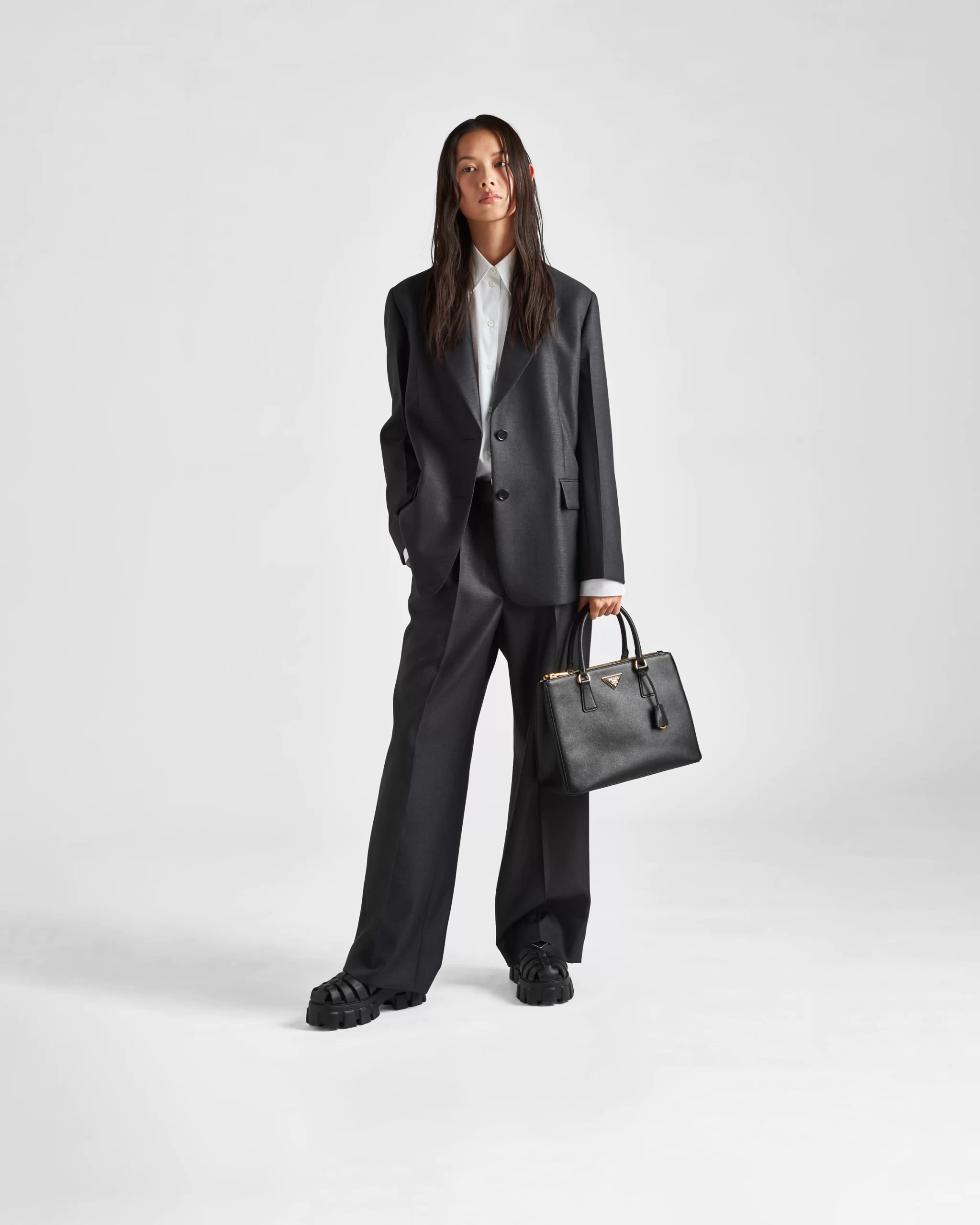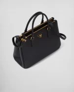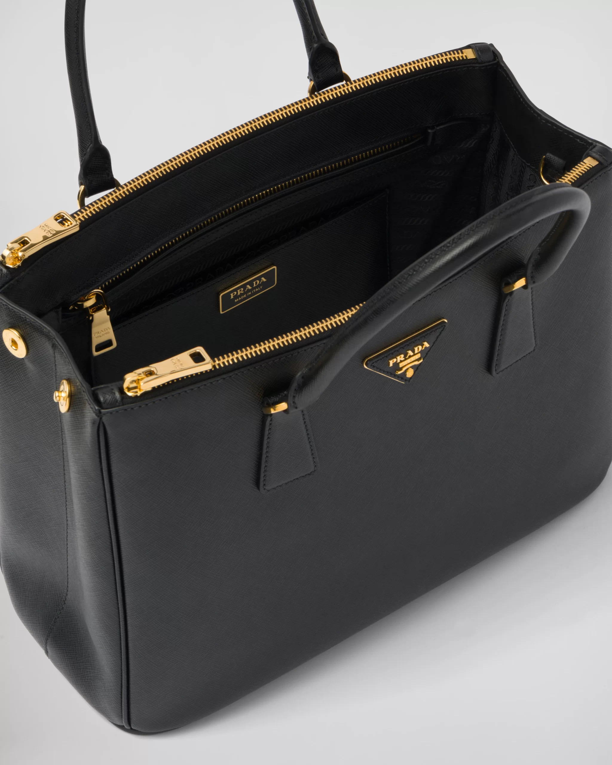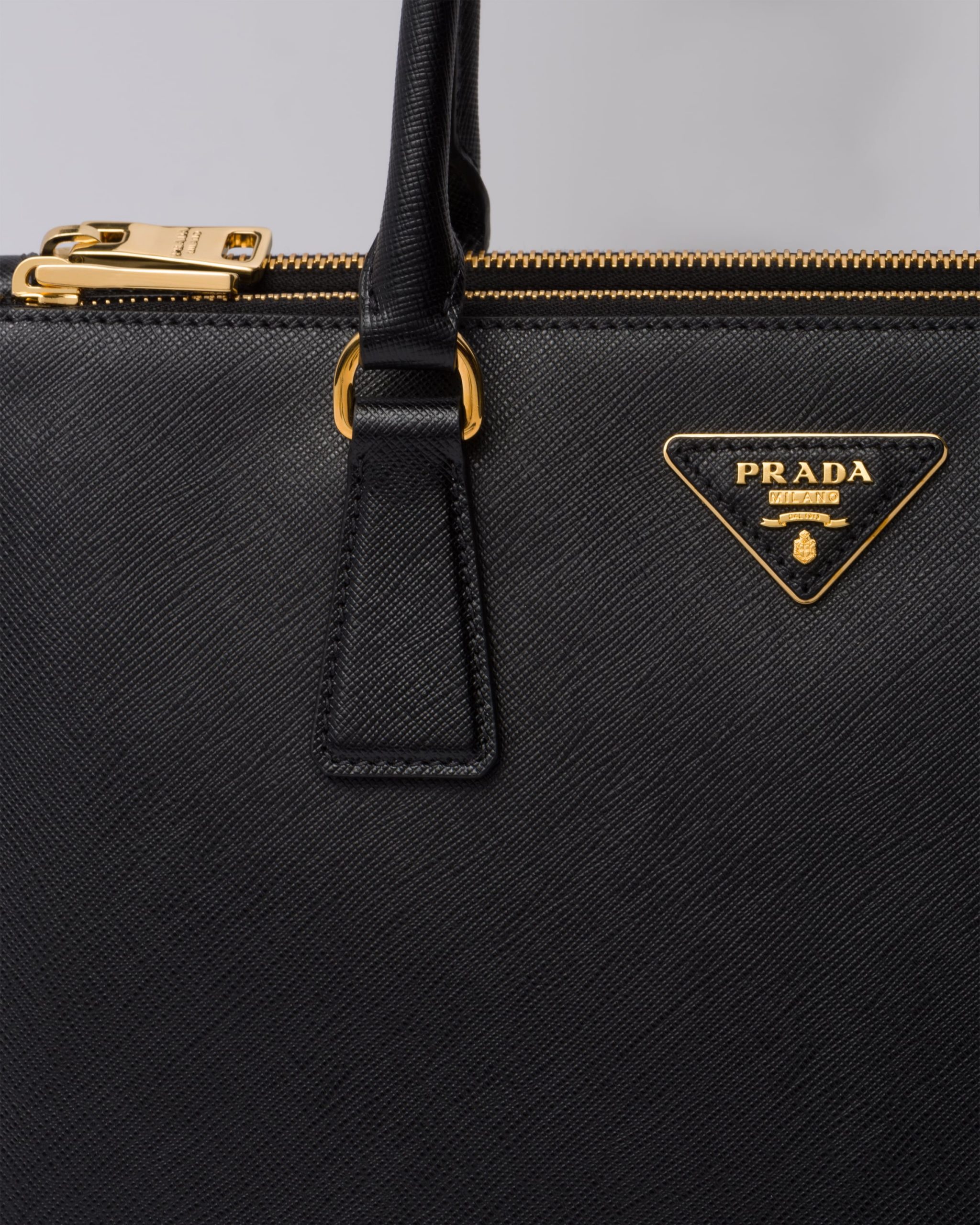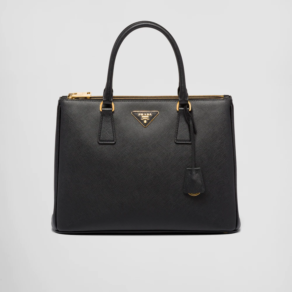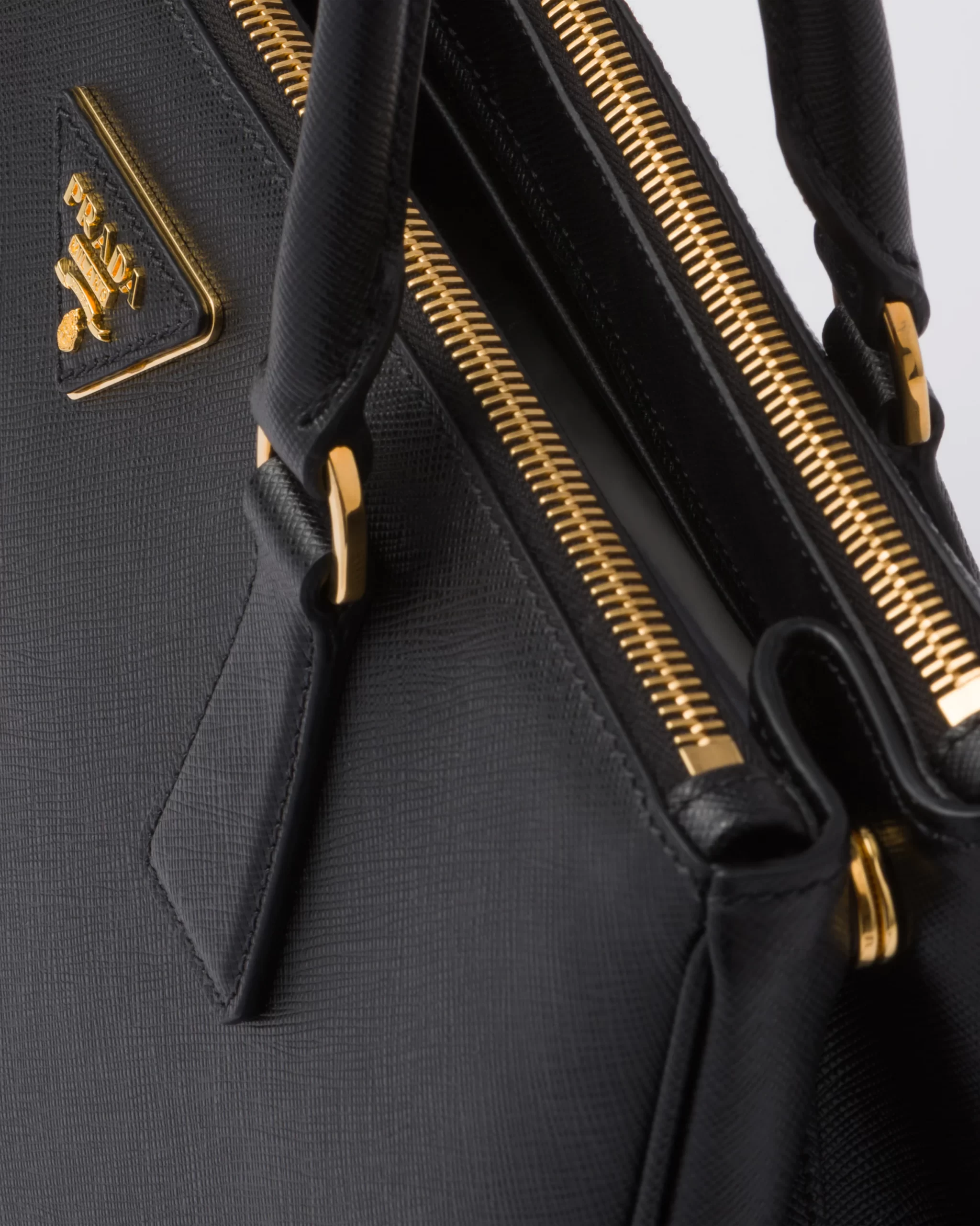 Production of the Prada Galleria bag, composed of 83 pieces, is an authentic fusion between industrial precision and the refined accuracy of craftsmanship that can only be performed by hand. The design is clean and elegant yet innately pragmatic, an aesthetic language blending form and function that combines history and modernity. Originating the definition of “timeless”, the Galleria bag has become a hallmark of Prada’s identity in the twenty-first century. The accessory, presented in the large version, is made of iconic Saffiano, a calf leather patented by Mario Prada that is resistant to scratches and water and defined by its crosshatch texture.Product code: 1BA274_NZV_F0002_V_DOOLeather handlesDetachable adjustable 115 cm leather shoulder strapRemovable leather key ringExternal zipper pocketsMetal hardwareLeather triangle with metal lettering logo on the frontSnap closure on the sidesLogo-print nylon lining with four pockets, including one zipper pocketWith purse feetHeight: 24cmLength: 13.5cmWidth: 32cm