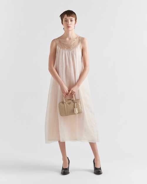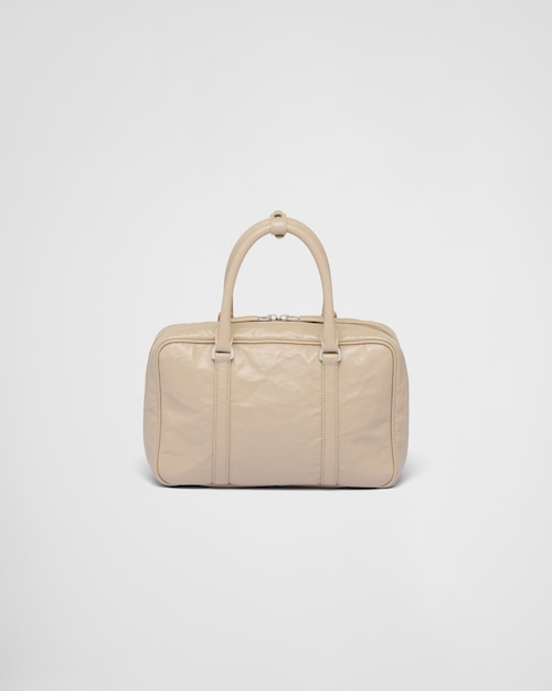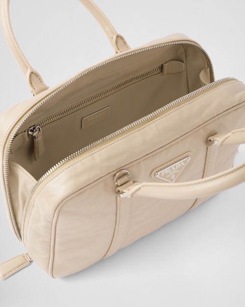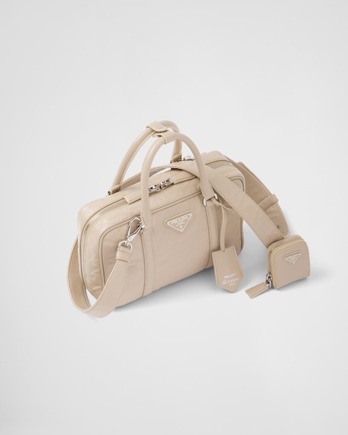 This bag with casual, classic allure is made of glossy nappa leather with a natural finish. The handmade wrinkled effect contrasts with the concept of a rigid construction, reinterpreting an everyday object that can be worn without constraints. Presented for the Spring Summer 2023 collection, the accessory that is a re-edition of a bag presented in 2001 is decorated with the enameled metal triangle logo.Product code: 1BB092_UVL_F0F24_V_T2OHandmade wrinkled effectNappa leather handlesDetachable, adjustable 105 cm nappa leather shoulder strapRemovable zipper pouch and Re-Edition keyringMetal hardwareEnameled metal triangle logo on the frontZipper closureNappa interior with two pockets, including one with zipperHeight: 15.5cmLength: 7cmWidth: 24cm