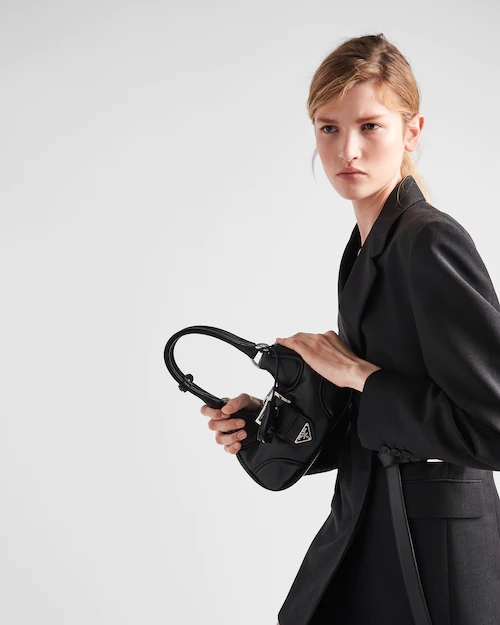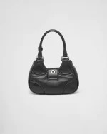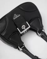 Reimagining the iconic lines of a model from the Prada archives from the 2000s, this nappa leather bag combines traditional elements reinterpreting them in a new way, with an innovative soft design. Softness and simplicity of the silhouette define this hobo bag, embellished by the ton-sur-ton triangle logo that frames the lettering logo, creating a three-dimensional and material game and enriching the design of the accessory.