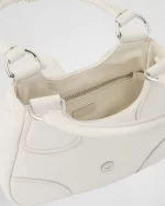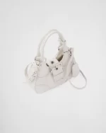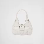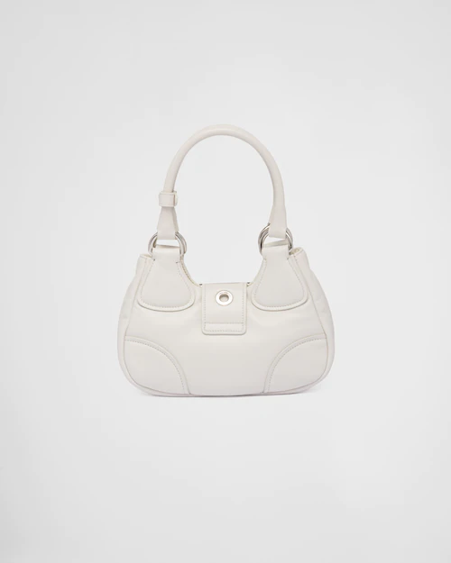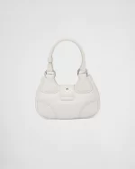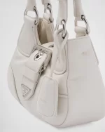 Reimagining the iconic lines of a model from the Prada archives from the 2000s, this nappa leather bag combines traditional elements reinterpreting them in a new way, with an innovative soft design. Softness and simplicity of the silhouette define this hobo bag, embellished by the ton-sur-ton triangle logo that frames the lettering logo, creating a three-dimensional and material game and enriching the design of the accessory.