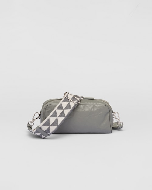 Product code: 1BH198_UVL_F0480_V_4OOHandmade wrinkled effectDetachable, adjustable 95 cm logo-print embroidered woven tape shoulder strapRemovable keyringFront zipper pocketEnameled metal triangle logo on the pocketZipper closureNappa lining with zipper pocketHeight: 10.5cmLength: 7cmWidth: 22cmMATERIALSLeather
