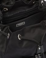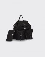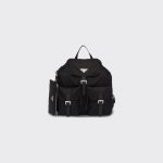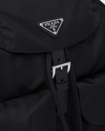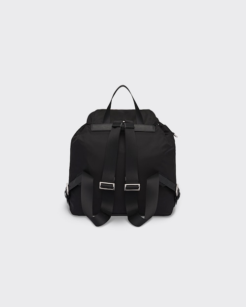 A blend of materials with modern allure and timeless charm are the choice for this iconic backpack of the brand that combines a base made of Re-Nylon, a sustainable evolution of the industrial fabric that is a Prada hallmark, and Saffiano leather details. The enameled metal triangle logo, an historic element reinterpreted each season on designs with contemporary charm, decorates the front.Product code: 1BZ811_RV44_F0002_V_OTOSaffiano detailsAdjustable woven nylon straps and handleRemovable Re-Nylon zipper pouchFront pockets with flap and buckle closureMetal hardwareEnameled metal triangle logo on the flapDrawstring closure with flap and buckleRe-Nylon logo-print lining with two pockets, including one with zipperHeight: 32cmLength: 15cmWidth: 30cm