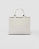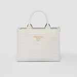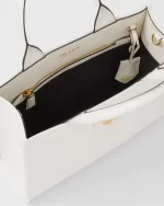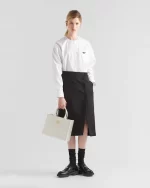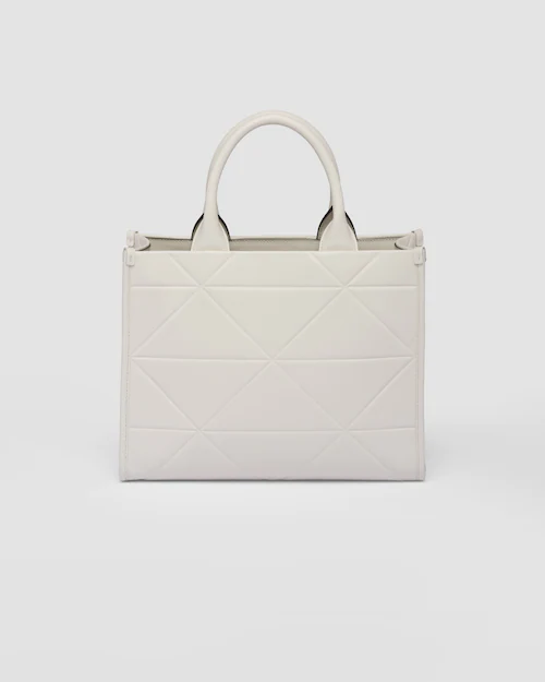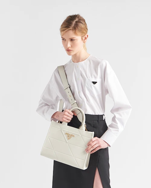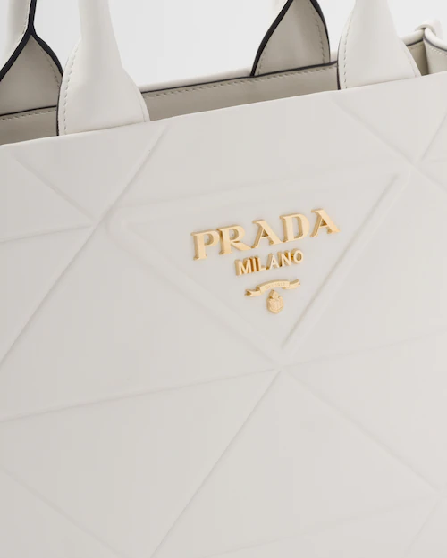 This elegant, minimalist leather handbag has two handles and a leather keychain inside. Steeped in a contemporary allure, this accessory features a motif that evokes the brand’s iconic geometric shape. Signature metal logo lettering stands out on the front.Product code: 1BA379_ASK_F0009_V_OCOStitched triangle motifLeather handlesDetachable, adjustable leather shoulder strap, length: 95 cmRemovable leather keychain insideMetal hardwareFront metallic logo letteringPrada nylon logo lining with two pockets, one with zipperHeight: 23.5cmLength: 9.5cmWidth: 30cm