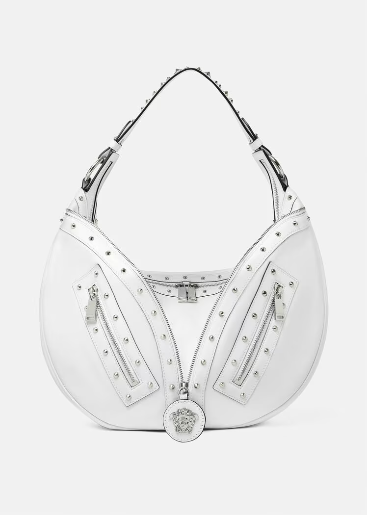 A re-edition of an archival hobo silhouette, the Repeat shoulder bag is crafted from supple Italian leather with a detachable shoulder strap. Biker-inspired, a Medusa charm puller and diagonal zippers add a grunge attitude with a Versace edge.