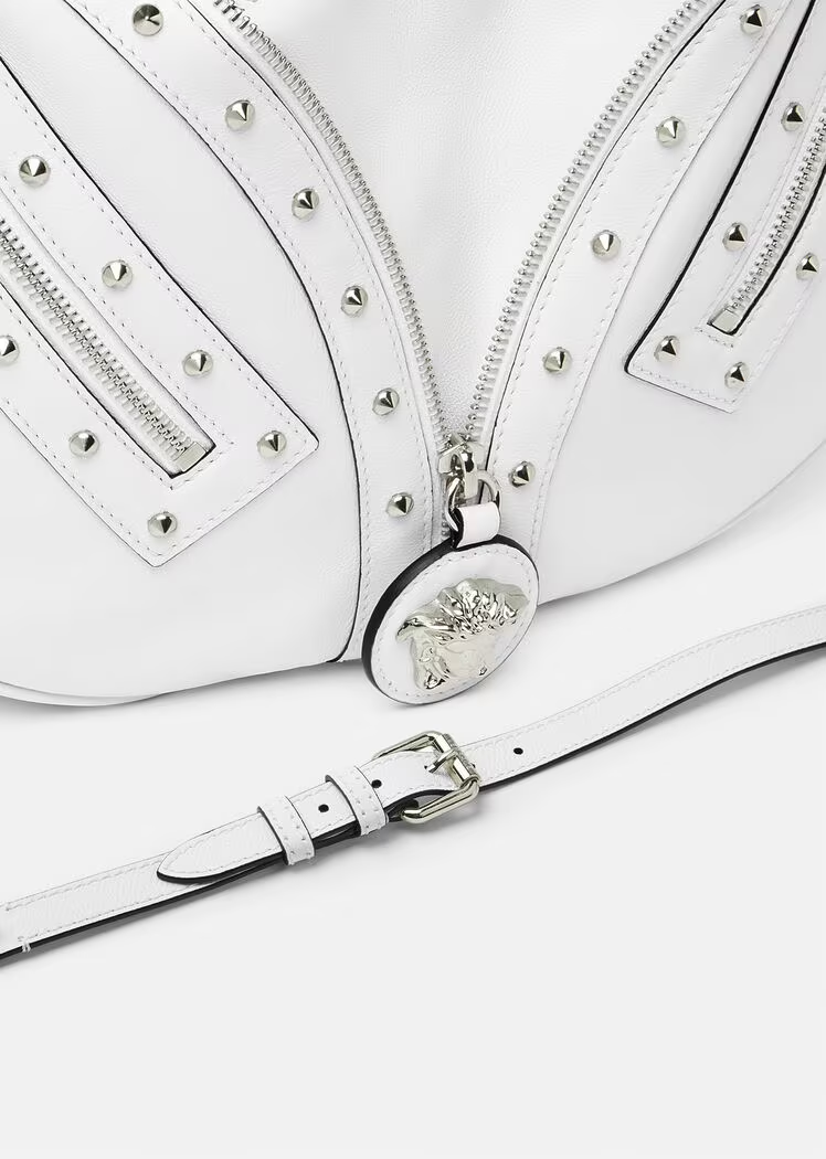 A re-edition of an archival hobo silhouette, the Repeat shoulder bag is crafted from supple Italian leather with a detachable shoulder strap. Biker-inspired, a Medusa charm puller and diagonal zippers add a grunge attitude with a Versace edge.