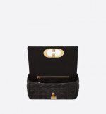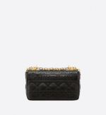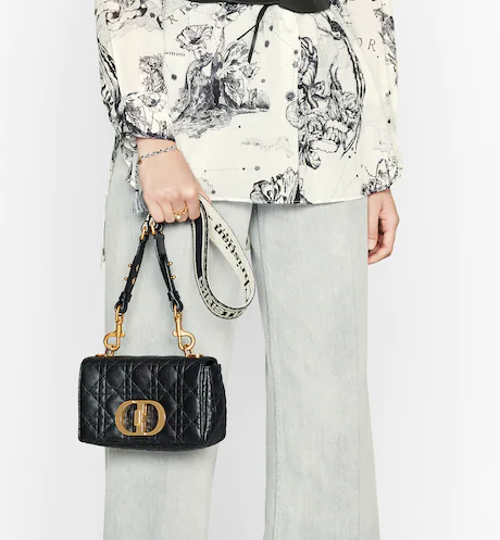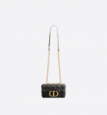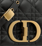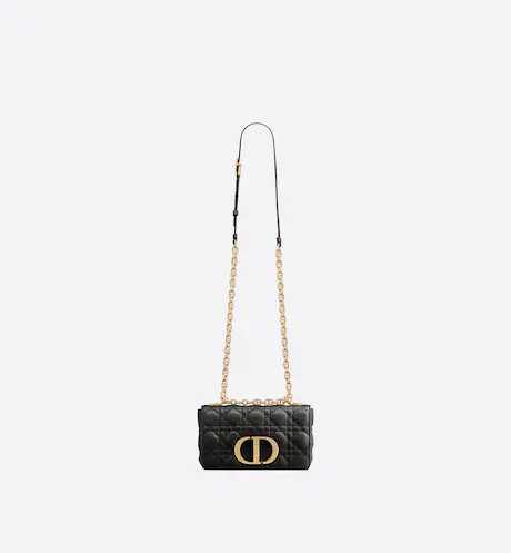 The Dior Caro bag combines modernity with timeless elegance. The design is crafted in black supple calfskin with Cannage stitching. The bag features a flap adorned with an antique gold-finish metal ‘CD’ twist clasp, inspired by the seal of a Christian Dior perfume bottle. The detachable chain shoulder strap with ‘CD’ signature links allows it to be carried by hand, over the shoulder or crossbody, or replaced by one of the House’s wide embroidered straps, allowing the small bag to pair with day or evening attire.