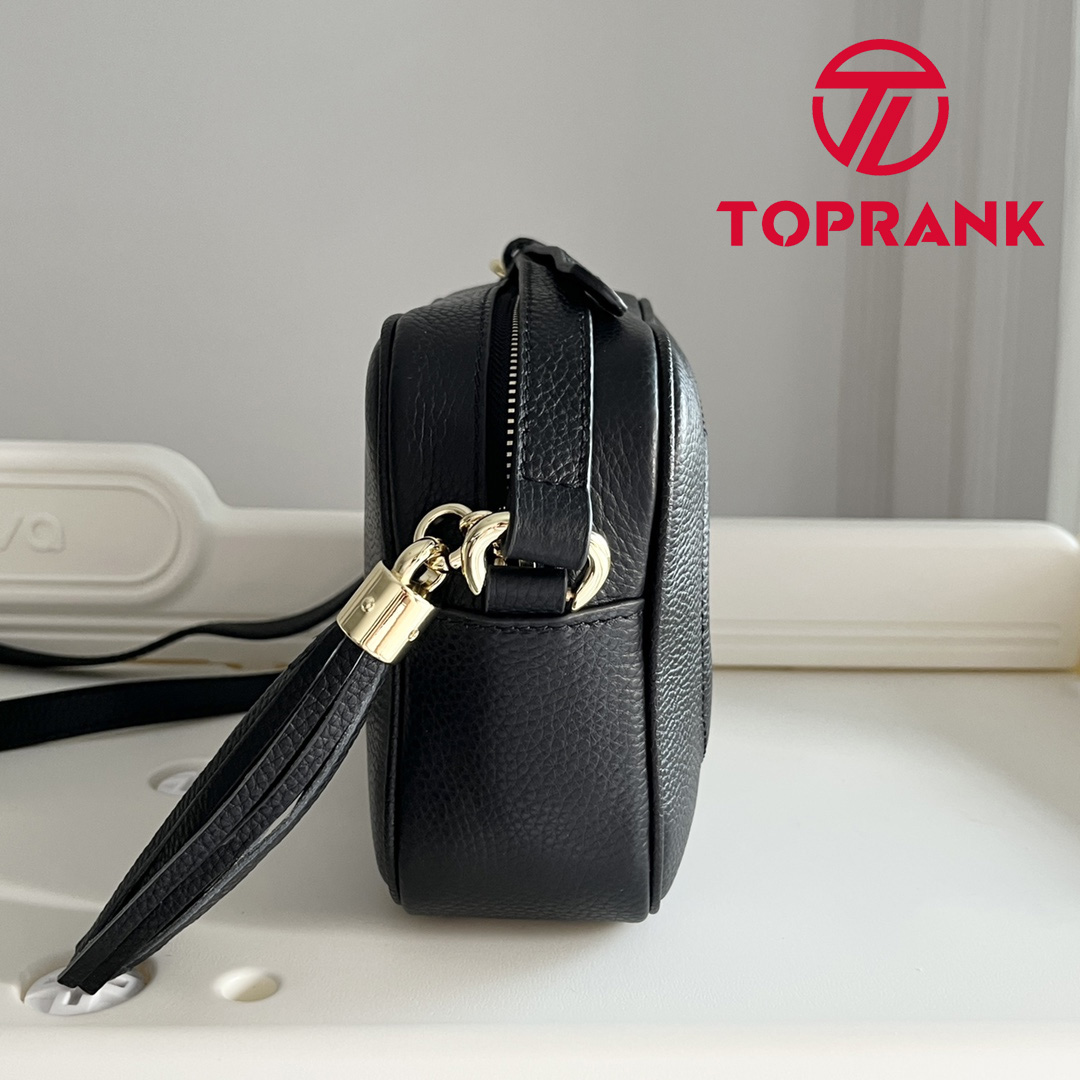 A compact shoulder bag with a leather tassel zipper pull. Sized to fit the necessities. Made in our light, natural grain leather.