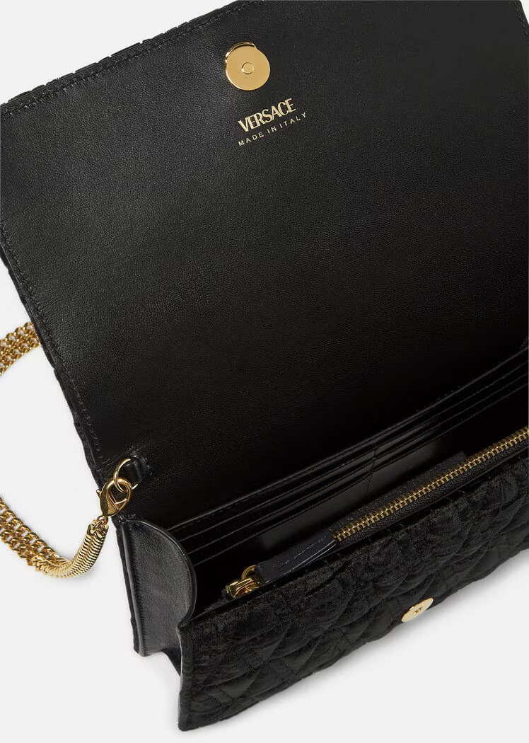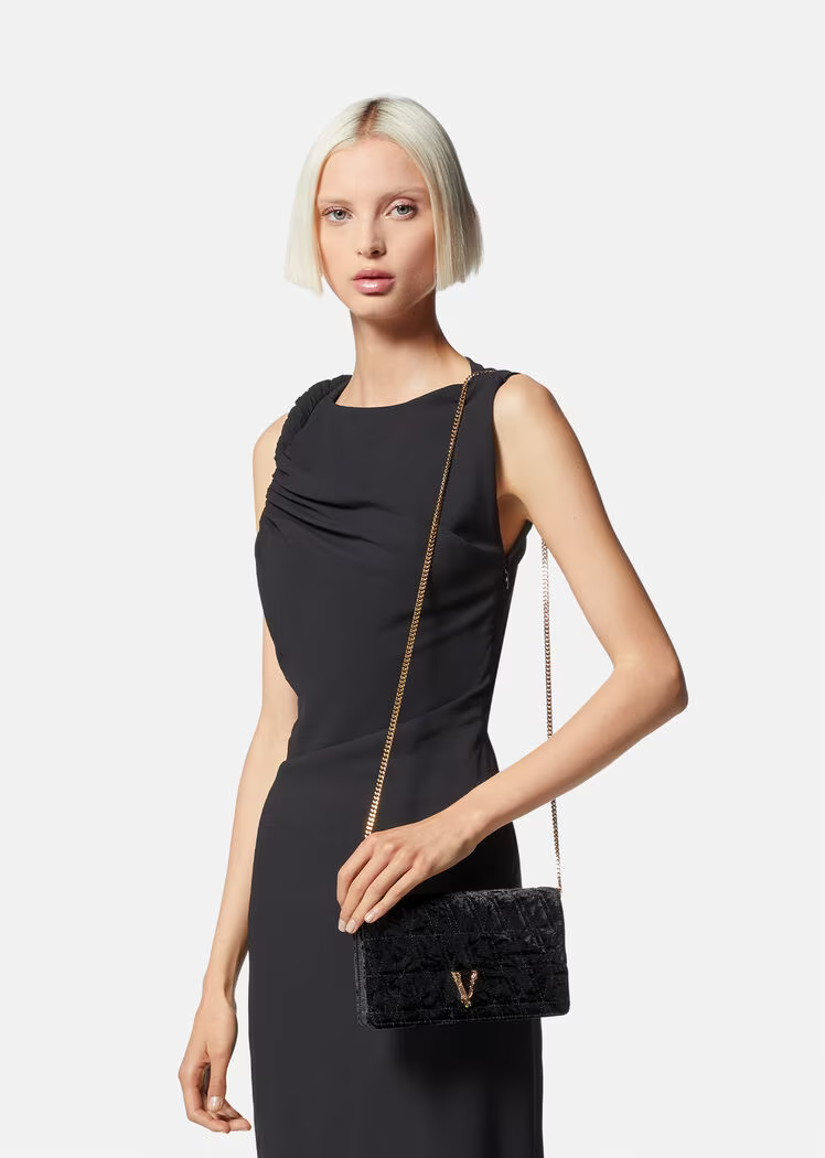 Crafted from velvet in a quilted V-pattern, the Virtus clutch features a Barocco V with engraved acanthus leaf detailing and magnetic flap closure. The small evening bag can be hand-held or suspended from a thin, detachable chain.