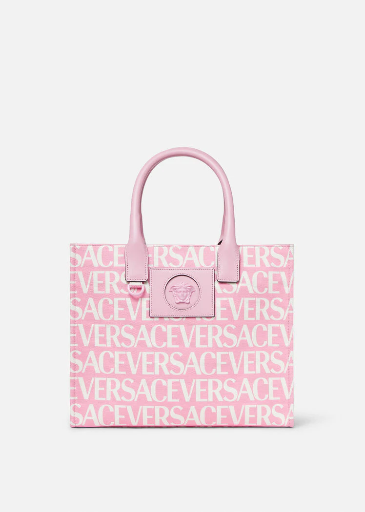 This canvas tote bag is adorned with a central La Medusa plaque and a contrasting Versace on Repeat logo. The rigid top handles are crafted from leather, and the spacious interior has a zipped pocket and a protector strap. The style comes with a detachable, and adjustable shoulder strap.