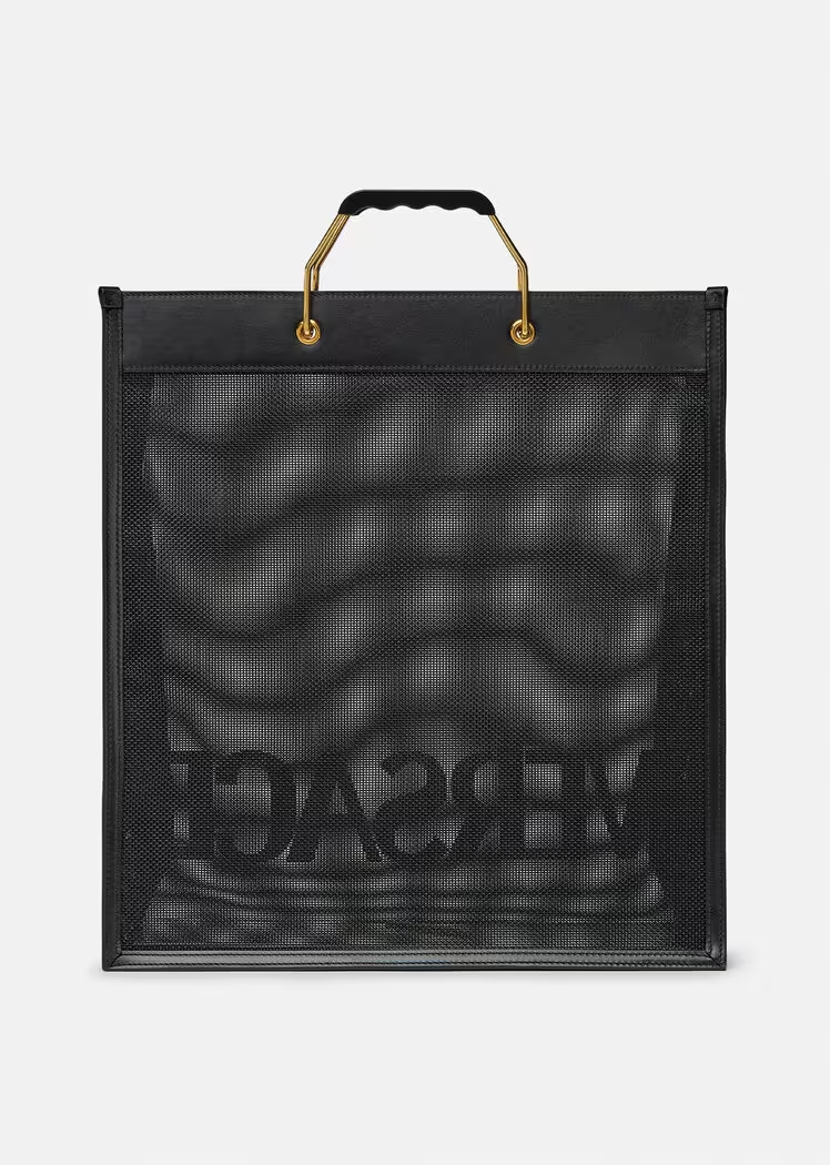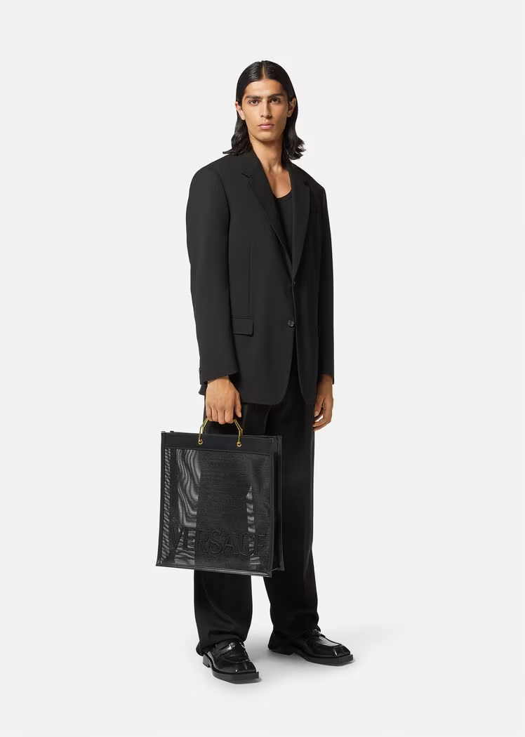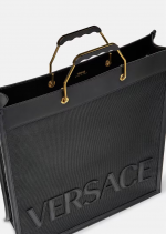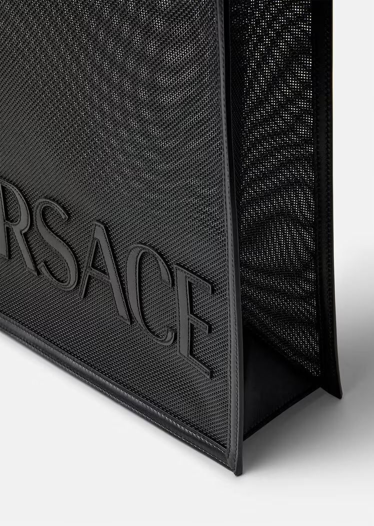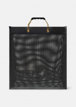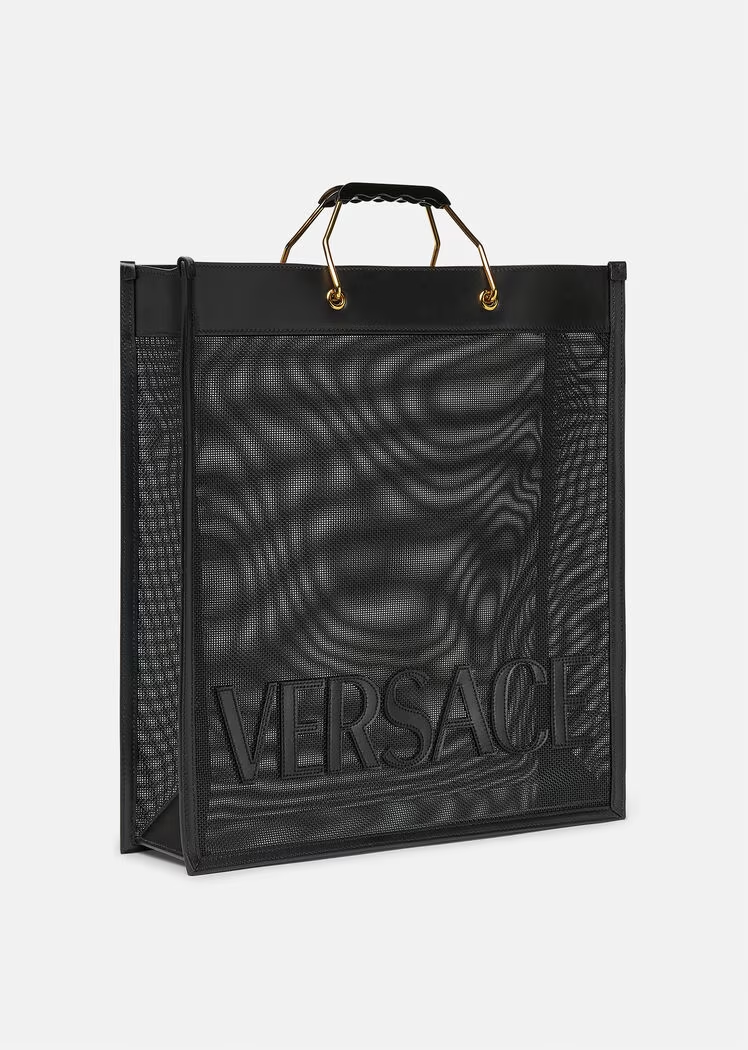 The Versace Shopper tote bag is made in a durable net construction with leather trims and tonal front logo lettering. Ergonomic, rigid metal top handles accent the spacious accessory.