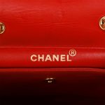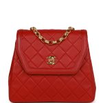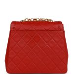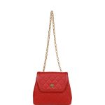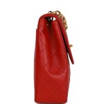 A Vintage Chanel Trapeze flap bag in red lambskin with gold hardware, featuring a front flap with classic gold plated CC turnlock closure and red leather and gold chain link shoulder straps.