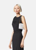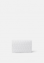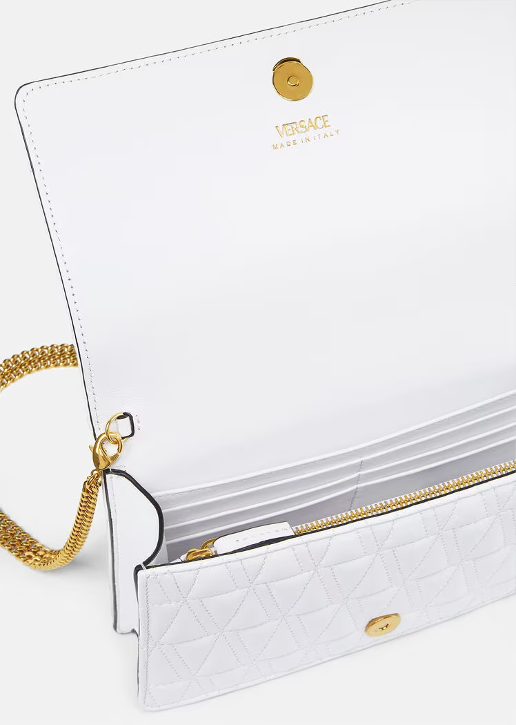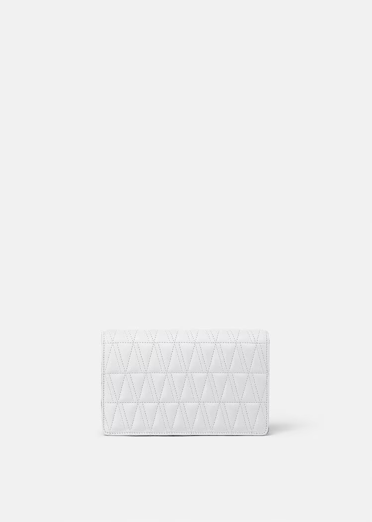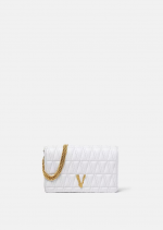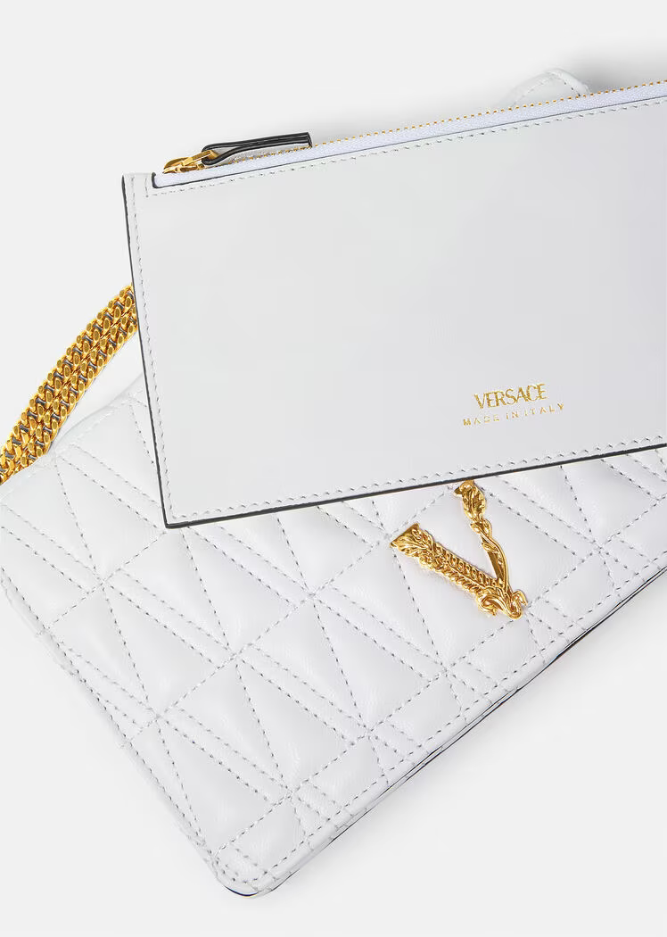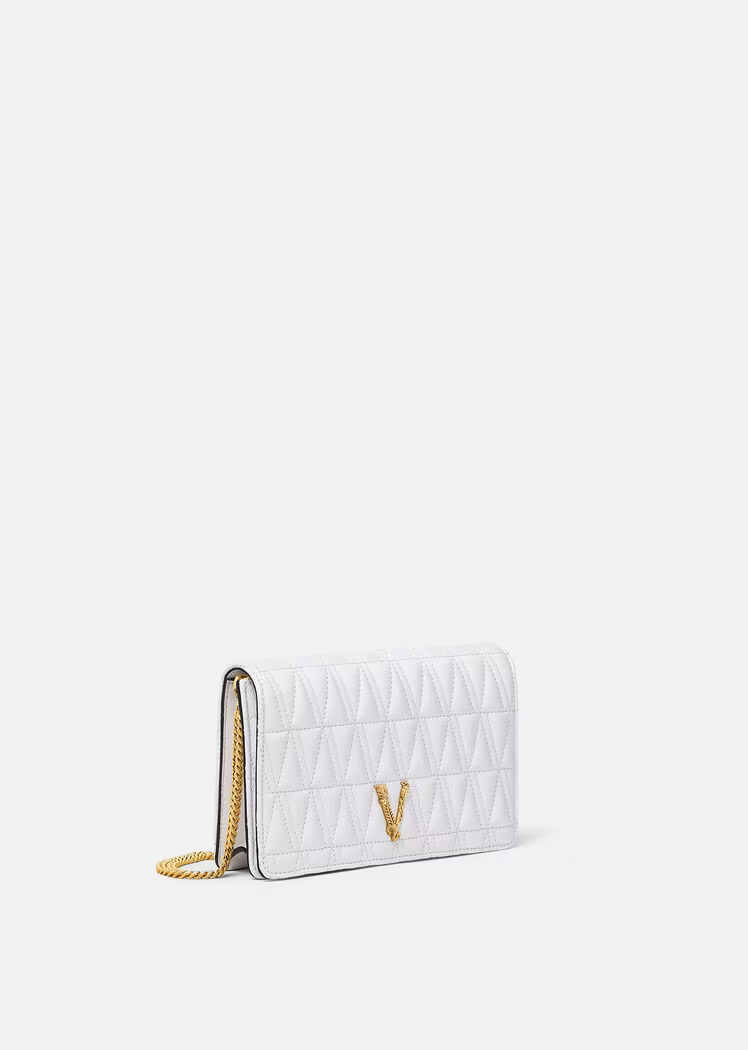 Crafted from leather in a quilted V-pattern, the Virtus clutch features a Barocco V with engraved acanthus leaf detailing and magnetic flap closure. The small evening bag can be hand-held or suspended from a thin, detachable chain.