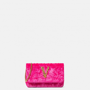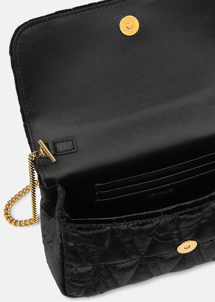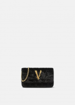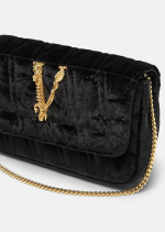 Crafted from soft textured, velvet with a quilted V-pattern, the Virtus mini bag features a Barocco V with engraved acanthus leaf detailing and a magnetic flap closure. The small evening bag is complete with a shoulder chain strap and internal card slots.